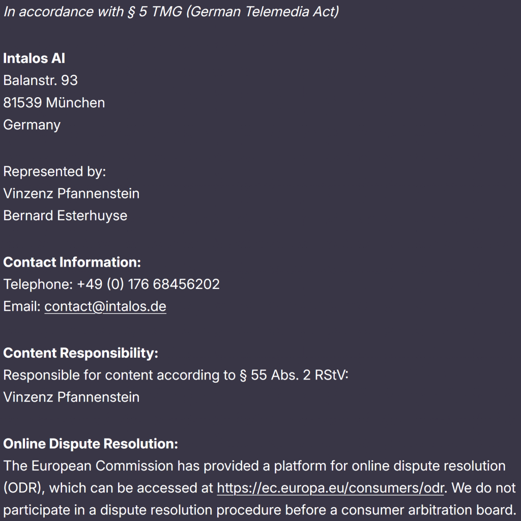 - Information provided on this website is for general informational purposes only. Although every effort is made to ensure the content is accurate and up-to-date, Intalos AI GmbH does not assume any liability for any inaccuracies or omissions.